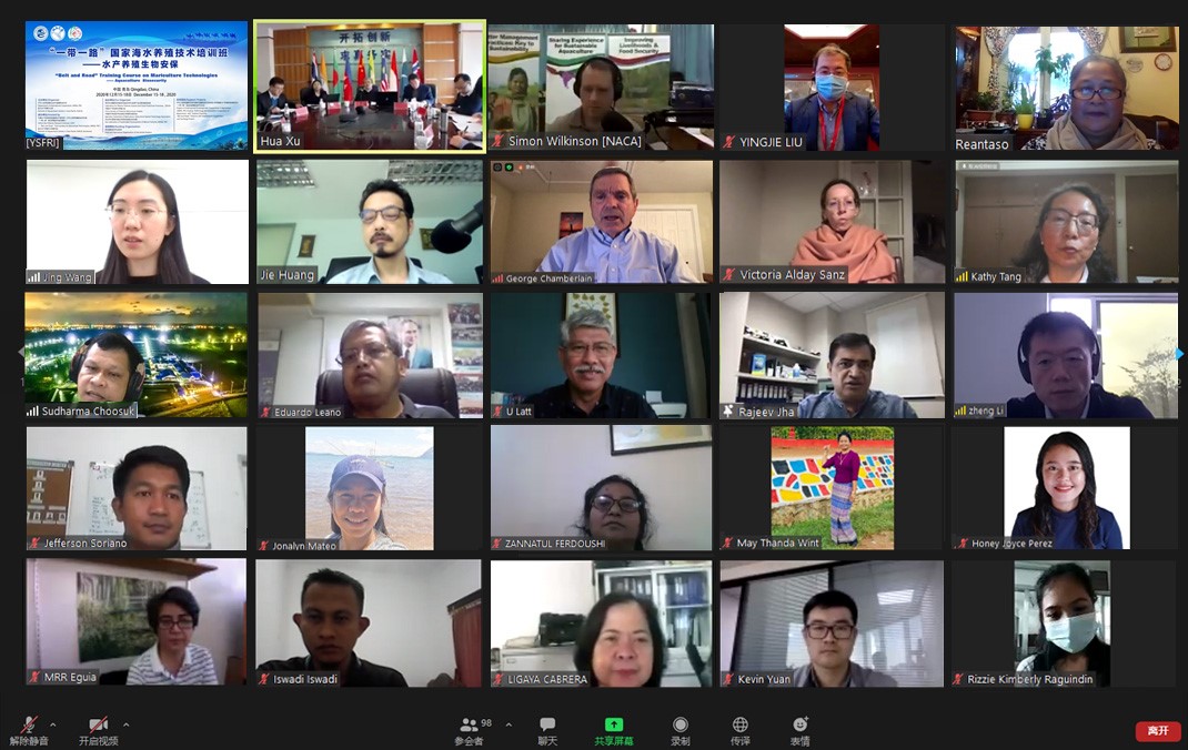12月15日至18日,農(nóng)業(yè)農(nóng)村部2020年“一帶一路”國家海水養(yǎng)殖技術(shù)培訓(xùn)班(二期)成功舉辦。本次培訓(xùn)由農(nóng)業(yè)農(nóng)村部國際合作司和亞太水產(chǎn)養(yǎng)殖中心網(wǎng)(NACA)主辦,中國水產(chǎn)科學(xué)研究院黃海水產(chǎn)研究所農(nóng)業(yè)農(nóng)村部“一帶一路”海水養(yǎng)殖技術(shù)培訓(xùn)基地和亞太水產(chǎn)養(yǎng)殖中心網(wǎng)秘書處承辦,青島海洋科學(xué)與技術(shù)試點(diǎn)國家實(shí)驗(yàn)室海洋漁業(yè)科學(xué)與食物產(chǎn)出過程功能實(shí)驗(yàn)室、中國水產(chǎn)學(xué)會(huì)海水養(yǎng)殖分會(huì)、中國農(nóng)村專業(yè)技術(shù)協(xié)會(huì)海水養(yǎng)殖專業(yè)委員會(huì)、農(nóng)業(yè)農(nóng)村部海洋漁業(yè)可持續(xù)發(fā)展學(xué)科群、黃海水產(chǎn)研究所聯(lián)合國糧食及農(nóng)業(yè)組織(FAO)水產(chǎn)養(yǎng)殖生物安保與微生物耐藥參考中心和世界動(dòng)物衛(wèi)生組織(OIE)WSD及IHHN參考實(shí)驗(yàn)室協(xié)辦。來自亞洲、歐洲、非洲和拉丁美洲32個(gè)國家和地區(qū)的高校、科研院所、政府部門、行業(yè)協(xié)會(huì)和企業(yè)的321位學(xué)員進(jìn)行了為期4天的線上學(xué)習(xí)交流。