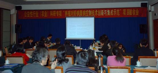 項目首席專家黃倢研究員代表項目組向驗收組匯報了“養殖對蝦病毒病控制技術創新與集成示范”項目的總體執行情況、取得的關鍵技術成果和效益以及財務管理情況;國家海洋局第三海洋研究所、水科院南海所、中國海洋大學、中科院海洋研究所等12家協作單位分別就子項目的執行情況進行了匯報。