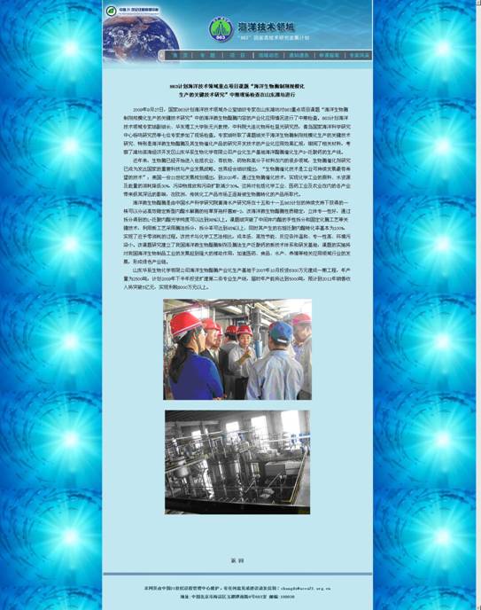 黃海所承擔的國家“十一五”863計劃海洋技術領域“新型海洋生物制品研究開發”重點項目課題之一“海洋生物酶制劑規模化生產的關鍵技術研究”自2009年9月27日立項以來,已取得多項階段性成果,其中:“海洋微生物酯酶及其生物催化產品研究開發技術的產業化應用”得到了專家組的充分肯定,科技部國家863海洋技術領域對該研究成果進行了宣傳。(詳見http://www.863.org.cn/)