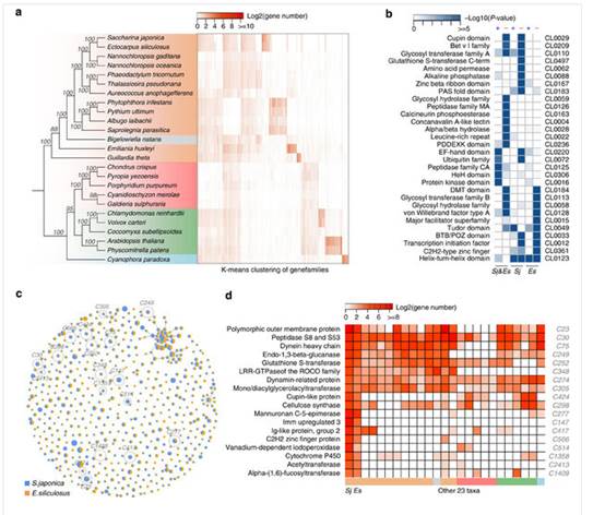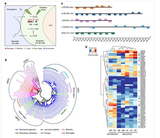 研究團(tuán)隊(duì)獲得了海帶主要栽培品系的高質(zhì)量基因組組裝結(jié)果,組裝大小為537 Mb,覆蓋了全基因組序列的98.5%,共有18,733個(gè)蛋白編碼基因。比較基因組學(xué)分析發(fā)現(xiàn)海帶基因組擴(kuò)增主要源于基因家族的擴(kuò)增,海帶與絲狀褐藻水云的祖先獲得1,240個(gè)基因家族,其中與細(xì)胞壁合成、鹵素代謝、發(fā)育與防御有關(guān)的基因家族出現(xiàn)明顯擴(kuò)增。進(jìn)一步的功能分析發(fā)現(xiàn),褐藻膠合成關(guān)鍵酶甘露糖醛酸C-5差向異構(gòu)酶及鹵素代謝關(guān)鍵酶鹵素過氧化物酶通過基因大量復(fù)制實(shí)現(xiàn)其功能分化。