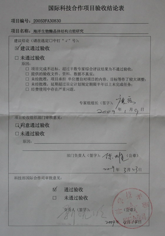 近日,黃海所主持的科技部國際合作計劃重點項目“海洋生物酶晶體及結構與功能研究”順利通過了由科技部國際合作司組織的專家驗收。