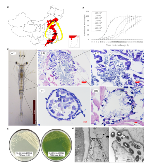 針對2020年初導致我國沿海地區50%以上凡納濱對蝦育苗(標粗)場關閉的大規?!安A纾═ranslucent Post-larva Disease,TPD)”病害問題,海水蝦類流行病學與病害防控創新團隊及時響應,與凡納濱對蝦和中國對蝦遺傳育種創新團隊開展聯合攻關,率先確定一種高毒力副溶血弧菌(VpTPD)是引發該病害的病原。明確了VpTPD感染主要導致對蝦肝胰腺與腸道上皮細胞的急性病變,進而引發染病仔蝦的快速死亡。流行病學研究揭示出該病害最早于2018-2019年前后零星出現于我國華南對蝦養殖地區,2020年春隨對蝦苗種運輸迅速傳播、擴散至我國華東、華北等沿海地區,初步查明了該病害在沿海主要對蝦養殖地區的流行情況。及時向國家漁業主管部門提交應急防控方案,為主管部門決策提供了理論與技術支撐。