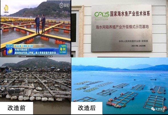 針對福建省寧德地區傳統網箱養殖存在的設施簡陋、抗風浪能力差、漁排布放過密、養殖病害頻發、養殖效益下降等問題,陸海接力養殖創新團隊研發了“大套小”方形塑膠浮臺式網箱和HDPE“板材+環保浮球”式漁排,優化了網箱設施海域布放方式與數量,同福建金貝爾公司、寧德富發公司、福建閩威公司等單位合作完成了新型網箱和漁排的商品化生產和推廣應用,并在寧德市三都澳海域建成“海水網箱養殖產業升級模式示范基地”。2020年在寧德市蕉城區累計完成傳統網箱升級改造近8萬口,面積約160萬m2。通過新設施的研發與新模式的構建,提高了養殖設施的抗風浪能力,解決了傳統網箱養殖“白色污染”問題,成為寧德市“海上漁排養殖設施升級改造”項目的樣板工程。