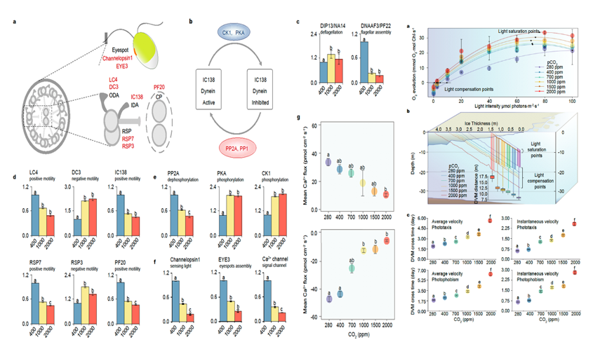 評估和預測氣候變化對水生生物群體及其生態系統的影響是極具挑戰性的國際前沿科學問題。海洋藻類種質創制與利用創新團隊首次從鞭毛運動和再生能力角度,解析了水體酸化對微藻運動能力的負面影響及機制,闡述了運動能力改變對微藻群體演變的潛在影響,為系統研究氣候變化條件下水域生態系統生物多樣性格局變遷提供了新的研究思路和重要的理論依據。該研究通過對極地冰藻、廣鹽性鹽藻和淡水萊茵衣藻等種類長達6年的室內傳代培養及野外中尺度實驗發現,CO2引起的水體酸化顯著降低了三種鞭毛微藻的運動速率,并影響鞭毛的再生能力。在Ca2+信號調節和磷酸化調節兩條途徑的交互作用下,鞭毛微藻運動能力大幅降低。相關成果發表在國際權威期刊Nature Climate Change。