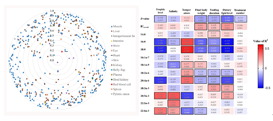 養殖魚類產品是目前人類獲取DHA等長鏈多不飽和脂肪酸的主要來源。然而,目前對水產養殖過程中脂肪酸由飼料到魚體的準確流轉關系并不十分清楚。針對此問題,海水養殖動物營養生理與代謝調控創新團隊構建了養殖魚類“飼料-魚體”脂肪酸組成關系數據庫,并通過構建一系列數學模型以定量化方式評估了脂肪酸從飼料向魚體的流轉過程;同時,進一步將魚體初重、營養級、投喂周期、飼料脂肪水平、養殖過程鹽度和溫度等環境因子的值同“飼料-魚體”脂肪酸關系評估參數進行了相關性分析,實現了對這些因素影響脂肪酸從飼料到魚體流轉過程的精準化定量評估。相關研究成果為養殖魚類脂肪酸流轉和脂肪酸營養品質評價提供了重要的方法學創新,相關成果發表在國際權威期刊Progress in Lipid Research。