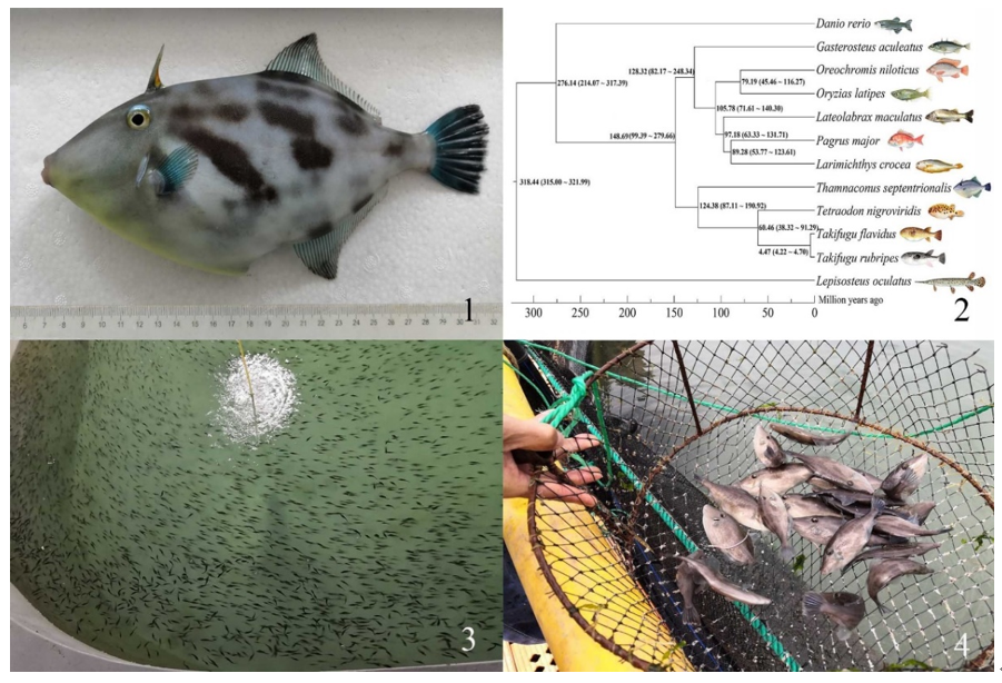 綠鰭馬面鲀作為我國海水養殖業重要的新興品種,其苗種的規模化繁育與高效養殖模式構建等問題仍未得到有效解決。珍稀海洋生物繁殖與保護團隊開展了綠鰭馬面鲀種質資源調查評估,構建了核心繁育群體,優化了受精卵收集和孵化技術,顯著提升了孵化率;突破了生殖調控技術,實現了親魚性腺發育進程的人工控制,提高了親魚群體的產卵同步率和受精質量,實現“按需繁殖”。解決了初孵幼體開口難的技術瓶頸,實現了優質苗種的規?;嘤焕眉{米孔測序技術(Nanopore)和染色體構象捕獲技術(Hi-C)完成了綠鰭馬面鲀基因組精細圖譜繪制,contig N50達到目前魚類基因組的最高水平,為良種選育工作奠定了基礎。在養殖模式方面,建立了工廠化養殖、陸海接力、南北接力、近海-深遠海網箱養殖等多種養殖模式,保障了產業的可持續發展。該研究豐富了我國海水魚類養殖品種,創造了新的經濟增長點。