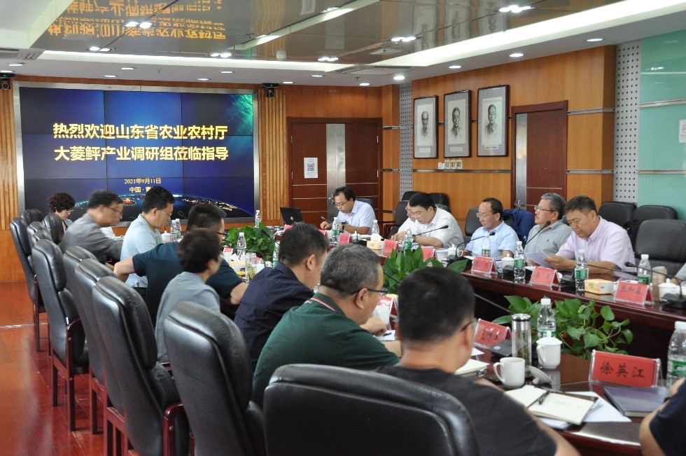 李健副所長(zhǎng)對(duì)王敬東副廳長(zhǎng)一行來(lái)所調(diào)研表示歡迎,并通過(guò)宣傳片詳細(xì)介紹了黃海水產(chǎn)研究所建所70多年來(lái)在科技創(chuàng)新、學(xué)科平臺(tái)建設(shè)、成果轉(zhuǎn)化、產(chǎn)業(yè)技術(shù)支撐等方面取得的成績(jī)。王敬東副廳長(zhǎng)高度贊揚(yáng)了黃海水產(chǎn)研究所對(duì)山東省海洋漁業(yè)和水產(chǎn)養(yǎng)殖產(chǎn)業(yè)發(fā)展做出的貢獻(xiàn),特別是大菱鲆的引種與產(chǎn)業(yè)化推動(dòng)了鲆鰈類工廠化養(yǎng)殖產(chǎn)業(yè)的迅猛發(fā)展,掀起了我國(guó)第四次海水養(yǎng)殖產(chǎn)業(yè)化浪潮,支撐了山東省海洋漁業(yè)經(jīng)濟(jì)的快速發(fā)展。他指出,山東是漁業(yè)大省,海水養(yǎng)殖產(chǎn)量多年來(lái)一直位居全國(guó)之首,但近年來(lái)連續(xù)被福建超越、被廣東追趕,特別是大菱鲆養(yǎng)殖,由于受多重因素影響,產(chǎn)業(yè)萎縮低迷,其原因值得深思。面對(duì)大菱鲆產(chǎn)業(yè)現(xiàn)狀,政府有責(zé)任和義務(wù),也有必要通過(guò)深入調(diào)研,認(rèn)真梳理山東省大菱鲆產(chǎn)業(yè)發(fā)展情況,理清產(chǎn)業(yè)發(fā)展的痛點(diǎn)和制約瓶頸,了解基層養(yǎng)殖單位對(duì)產(chǎn)業(yè)發(fā)展的呼聲,為產(chǎn)業(yè)振興提供政策支持。
