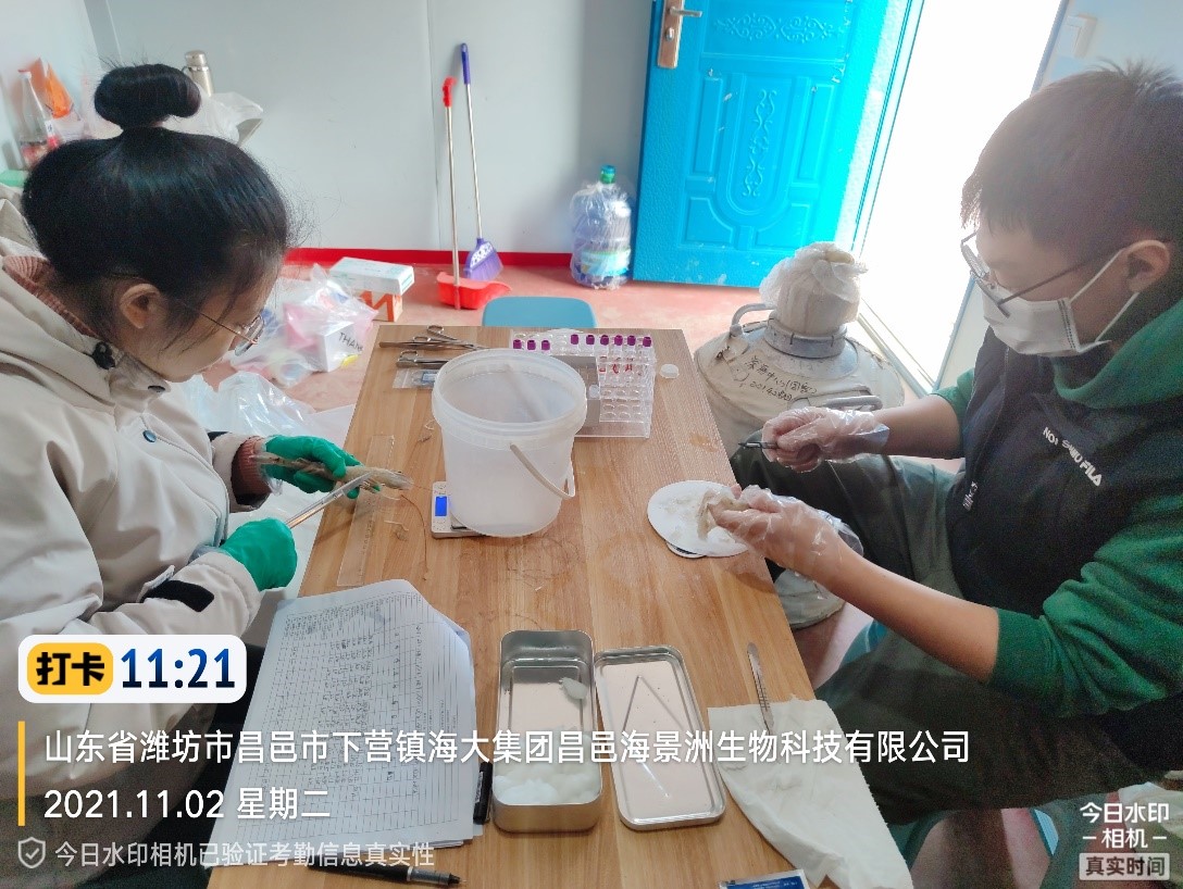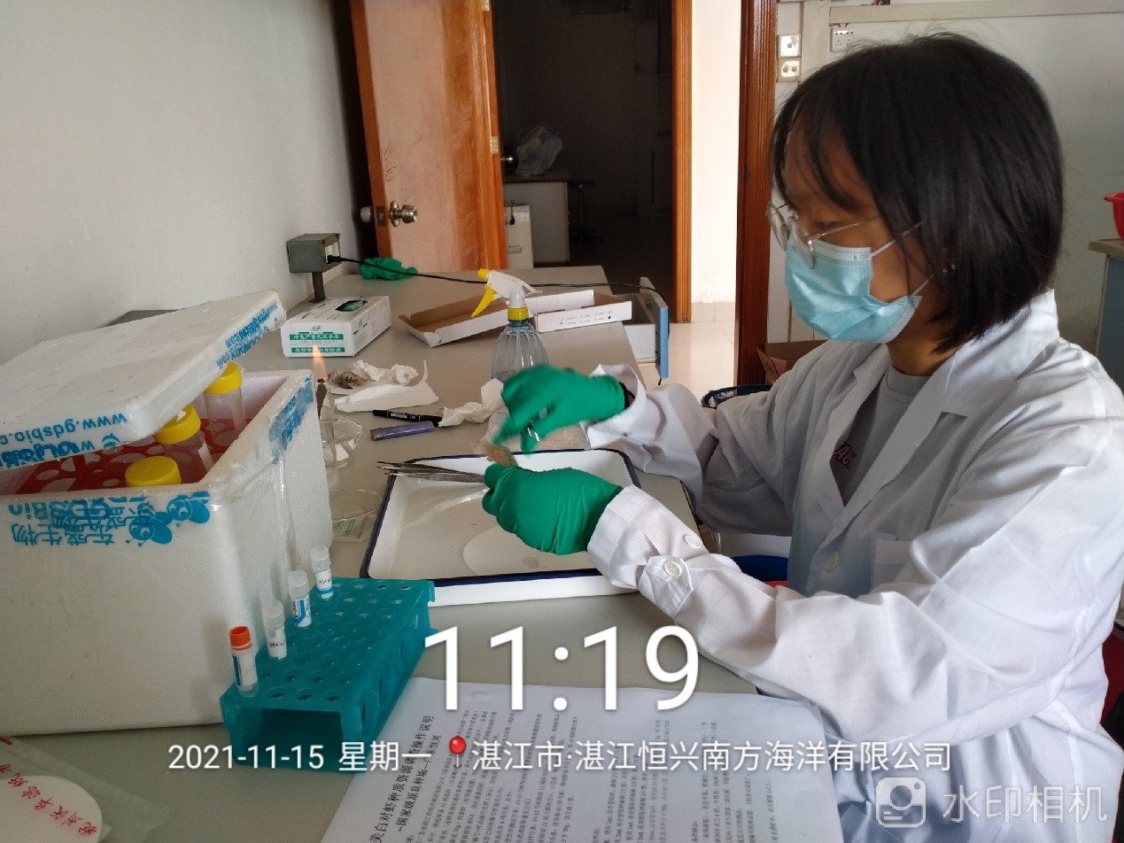 調查小組克服疫情反復、調查點多且分布較遠、樣品超低溫運輸困難等不利因素,科學制定采樣方案并迅速采取行動。10月至12月,調查小組先后對邦普種業科技有限公司、廣東海大集團現代漁業生態養殖示范園、天津興盛海淡水養殖有限責任公司、河北鑫海水產生物技術有限公司、海南中正水產科技有限公司、廣東恒興集團有限公司863基地、廣東南美白對蝦遺傳育種中心、廣西南美白對蝦遺傳育種中心、廣東海茂水產種業科技有限公司、浙江省海洋水產養殖研究所等10個點開展調查采樣。調查小組嚴格按照《蝦類樣品采集技術規范》進行生物學特性測量,根據調查點的單位類型、生產情況等信息認真填寫《水產養殖種質資源基礎信息表》,共獲取數據4600余條,按照檢測任務活體取樣740余份。