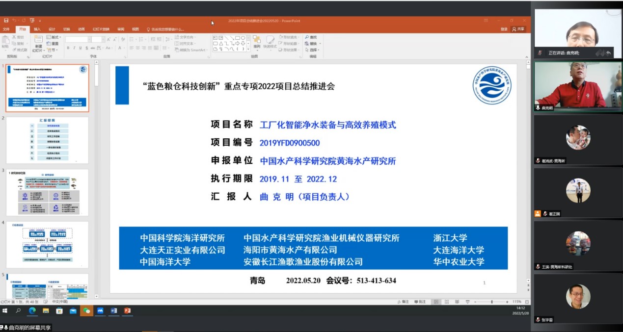 5月20日,由中國水產(chǎn)科學(xué)研究院黃海水產(chǎn)研究所牽頭承擔(dān)的國家重點研發(fā)計劃“藍色糧倉科技創(chuàng)新”重點專項“工廠化智能凈水裝備與高效養(yǎng)殖模式”(2019YFD0900500)2022年項目總結(jié)推進會以網(wǎng)絡(luò)視頻會議形式召開。項目咨詢專家組由中國水產(chǎn)科學(xué)研究院東海水產(chǎn)研究所所長方輝研究員、中國水產(chǎn)科學(xué)研究院漁業(yè)機械儀器研究所所長徐皓研究員、中國科學(xué)院煙臺海岸帶研究所呂劍研究員、浙江大學(xué)劉鷹教授和中國海洋大學(xué)宋協(xié)法教授組成,科技部中國農(nóng)村技術(shù)開發(fā)中心專項管理團隊項目專員王振忠、遲海與會指導(dǎo)。黃海水產(chǎn)研究所副所長葉乃好、科研處副處長王濱,以及項目負責(zé)人、課題負責(zé)人、項目組成員等30余人參加了本次會議。