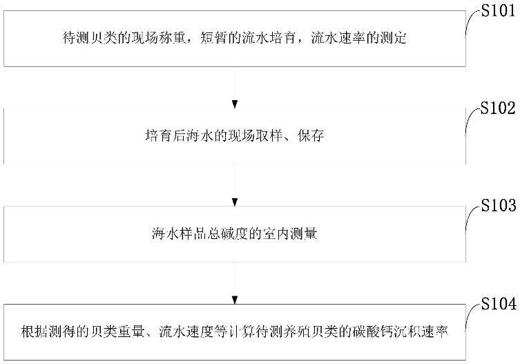 本發明屬于海水貝類養殖技術領域,公開了一種測定養殖貝類碳酸鈣沉積速率的方法及應用,包括待測貝類的現場稱重,短暫的流水暫養,流水速率的測定以及培育后海水的現場取樣、保存,海水樣品總堿度的室內測量以及根據測得的貝類重量、流水速度等計算待測養殖貝類的碳酸鈣沉積速率。