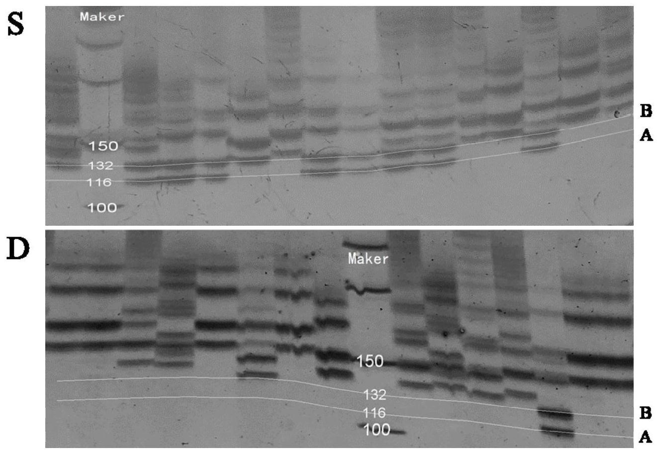 本發(fā)明涉及一個與紅鰭東方鲀耐低溫相關的微衛(wèi)星標記及其應用,屬于魚類DNA標記技術與應用領域,具體涉及紅鰭東方鲀耐低溫分子標記的篩選,以及利用標記進行分子標記輔助育種。利用BSA?SSR技術篩選到1個與紅鰭東方鲀耐低溫相關的微衛(wèi)星標記(fms108),其引物序列為正向:AACATGCGACAGAACTGACTG,反向:TCCACAGCCAATGTTAATGG。根據此標記可以進行育種親本的選擇,從而提高后代的耐低溫性能。