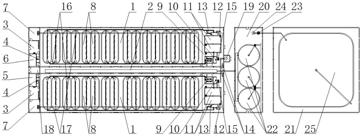 本發(fā)明屬于水產(chǎn)養(yǎng)殖技術(shù)領(lǐng)域,它包括親蝦培育車間養(yǎng)殖用水的內(nèi)循環(huán)的水處理裝置和循環(huán)水養(yǎng)殖車間外排水再利用的水處理裝置。本發(fā)明提供一種適合南美白對(duì)蝦親蝦培育的循環(huán)水養(yǎng)殖系統(tǒng)的水處理方法和循環(huán)水養(yǎng)殖車間外排水再利用的水處理方法,使親蝦培育期間的日補(bǔ)充新水降至0.5%以內(nèi),從而有效杜絕了外界病原對(duì)親蝦的入侵,為生產(chǎn)無特定病原(SPF)苗種及養(yǎng)殖系統(tǒng)節(jié)能減排提供了有力保障。