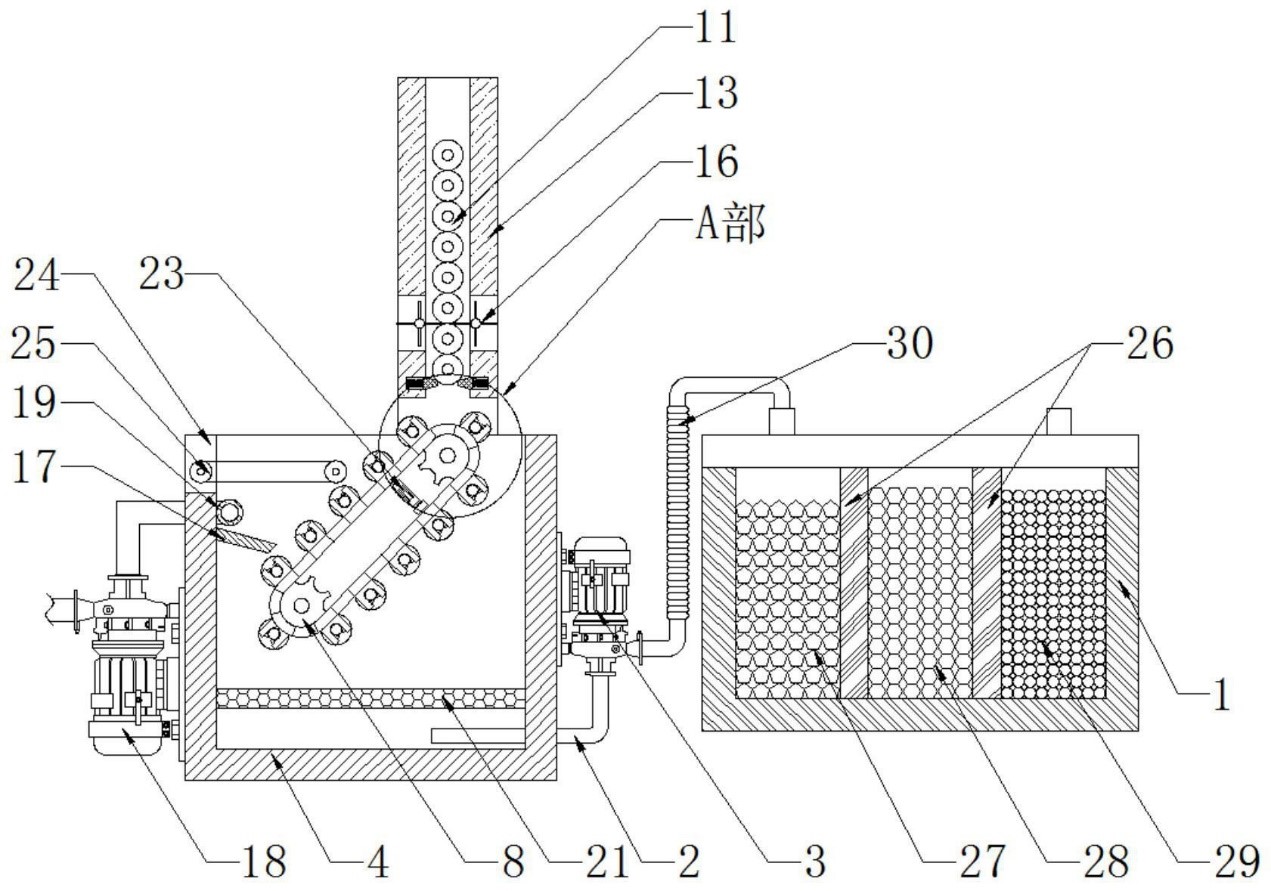 本發(fā)明涉及水產(chǎn)養(yǎng)殖設(shè)備技術(shù)領(lǐng)域。主動軸的兩端固定穿過兩側(cè)的主動齒輪后,與儲水池的前后兩側(cè)壁旋接;驅(qū)動電機與主動軸的后端固定連接;從動軸的兩端固定穿過兩側(cè)的從動齒輪后,與儲水池的前后兩側(cè)壁旋接;珊瑚絨輥兩端的轉(zhuǎn)動軸插設(shè)在夾座內(nèi);擋板的前后兩側(cè)固定在前后兩側(cè)的支撐板的內(nèi)壁上,擋條嵌設(shè)在擋板的一側(cè)壁上;抵觸彈簧嵌設(shè)在兩側(cè)的擋板內(nèi),驅(qū)動機構(gòu)設(shè)置于兩個支撐板之間;分流管與二號抽水泵的出水端連接,分流管設(shè)有通孔,珊瑚絨輥對養(yǎng)蝦尾水中的微藻進行過濾并收集,在光照條件下進而形成穩(wěn)定的藻菌共生生物被膜體系,可以用于養(yǎng)蝦尾水的脫氮除磷,并在一定程度降低COD,經(jīng)過處理后的養(yǎng)蝦尾水進入處理室后進行深度生化處理,可實現(xiàn)養(yǎng)殖尾水的達標排放。