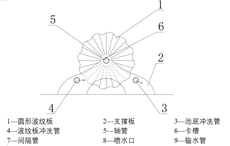 本發(fā)明屬于水產(chǎn)養(yǎng)殖裝備領(lǐng)域,所述裝置由可旋轉(zhuǎn)附著板組件和固定支架組件兩部分構(gòu)成;所述的可旋轉(zhuǎn)附著板組件包括圓形波紋板、軸管和間隔管;所述的圓形波紋板中心設(shè)有通孔,通孔的邊緣設(shè)有卡槽,圓形波紋板通過卡槽和間隔管形成一個排列均勻、并可圍繞軸管旋轉(zhuǎn)的組合體;所述的固定支架包括兩塊支撐板、一根波紋板沖洗管和一根池底沖洗管。具體實施時,把幾組海參工廠化循環(huán)水養(yǎng)殖自清潔附著裝置整齊擺放在養(yǎng)殖池內(nèi),沖洗時,沖洗泵給沖洗管提供高壓沖洗水,波紋板沖洗管沖洗附著板組件,并依靠水流帶動附著板組件可旋轉(zhuǎn);池底沖洗管沖洗池底,并在池內(nèi)形成渦流,到達(dá)排污效果。