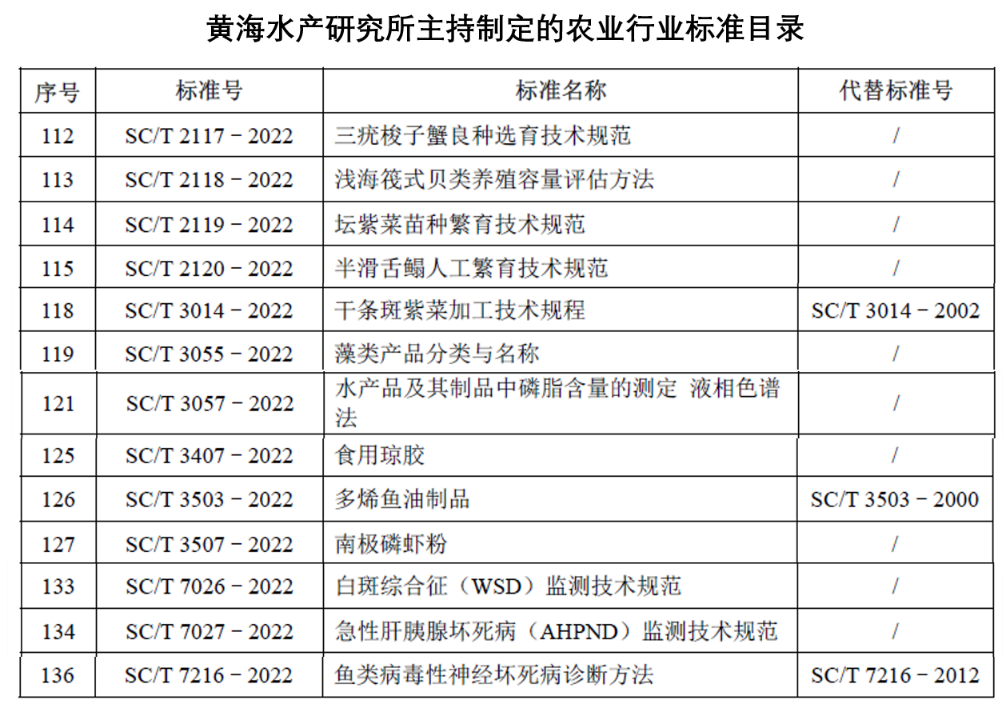 11月11日,農業農村部印發《中華人民共和國農業農村部公告第618號》,公布了160項經專家審定通過的農業行業標準,自2023年3月1日起實施。由中國水產科學研究院黃海水產研究所科研人員牽頭主持完成的13項農業行業標準正式獲批發布,其中包括良種選育規范4項、水產品加工領域6項及病害監測技術規范3項。以上標準的發布和實施,有利于規范和引導水產養殖、病害防控、水產加工行業的發展,對提高漁業管理水平、促進產業可持續發展和規范市場行為等方面發揮重要作用。