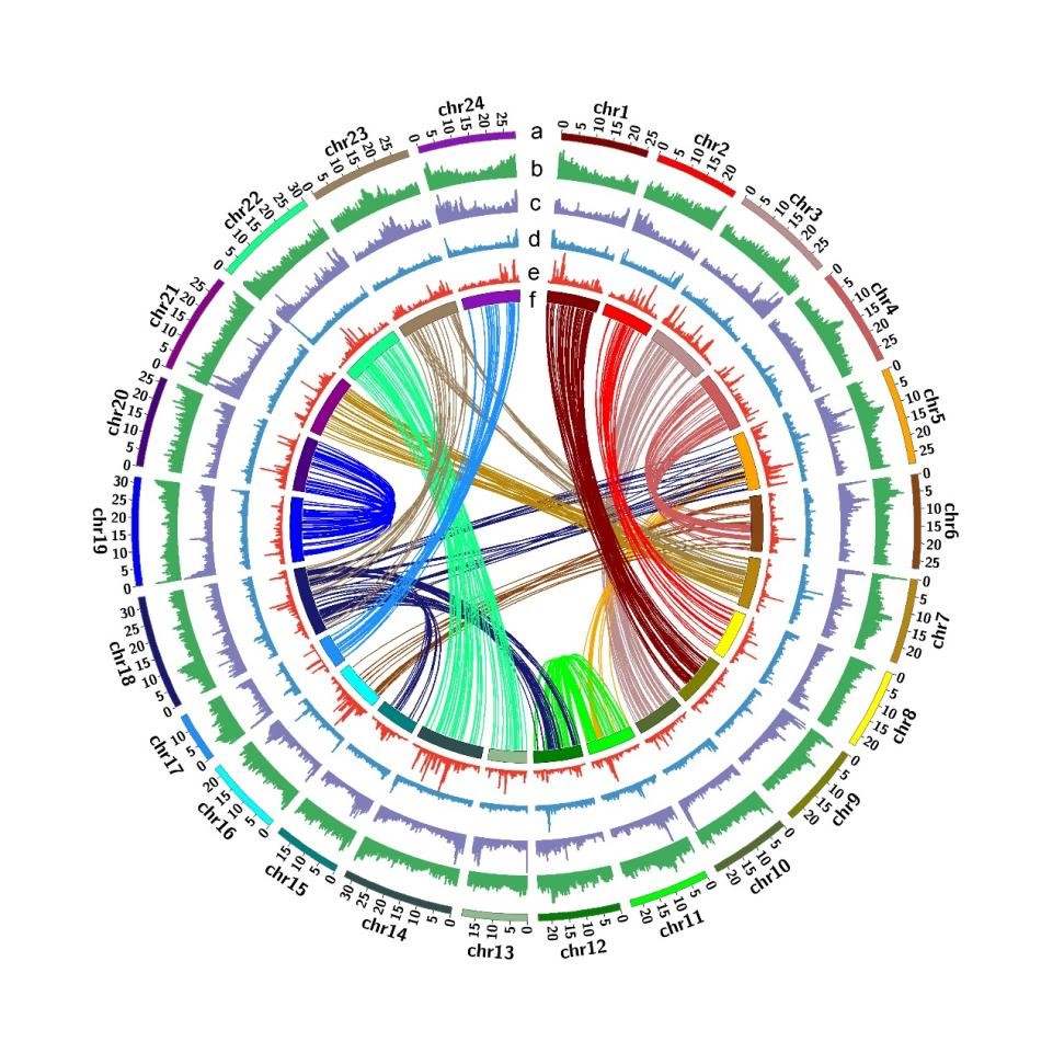 這項研究采用三代PacBio和二代Illumina平臺完成小黃魚基因組測序,并利用遺傳連鎖圖譜將基因組組裝至染色體水平。基因組大小為653 Mb,蛋白編碼基因24,625個,基因組完整度達到97%以上(圖1)。高質量染色體水平基因組圖譜的繪制為小黃魚的種群遺傳學研究以及基因組育種工作提供了重要的遺傳資源。