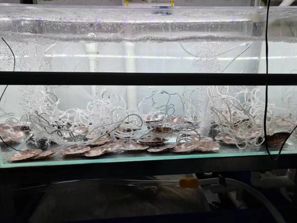 專家組進行了現場核查和取樣測量,查看了原始記錄,聽取了課題組的匯報,經質詢討論,形成驗收意見如下:該項研究探明了調控木下紫菜絲狀體生長發育及殼孢子放散的關鍵參數,攻克了木下紫菜苗種繁育技術;采用該技術,培養3~4周貝殼絲狀體孢子囊枝形成率達50%以上,孢子囊枝雙分細胞形成比例達60%以上;誘導3~5天殼孢子放散達到高峰,殼孢子日放散量達40萬/殼,貝殼絲狀體培育達到同步成熟、集中放散效果;殼孢子苗附著牢固、形狀完整、色澤健康。每平米貝殼絲狀體可采苗2畝以上。