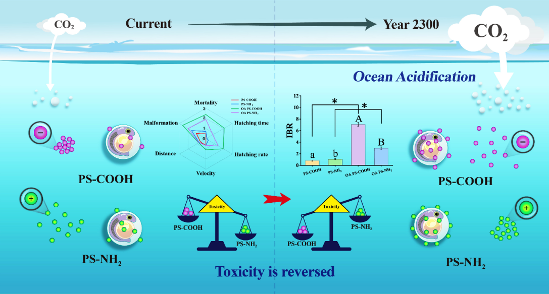 金屬氧化物納米顆粒和納塑料是典型的新污染物。研究團隊在海洋酸化耦合納米CuO顆粒/聚苯乙烯納塑料、UV-B輻射耦合納米TiO2顆粒對海洋生物的毒性效應(yīng)方面開展深入研究,取得一系列創(chuàng)新性成果。研究發(fā)現(xiàn),隨著UV-B輻射和納米TiO2顆粒暴露濃度/劑量的增加,UV-B輻射減弱了納米TiO2顆粒暴露下小球藻胞外聚合物的分泌,胞外聚合物對小球藻的保護作用減弱,導(dǎo)致更多的納米TiO2顆粒能夠進入藻細胞內(nèi)并誘導(dǎo)氧化損傷,該研究成果入選Environmental Science:Nano期刊封面文章。研究表明,海洋酸化逆轉(zhuǎn)了不同表面電荷聚苯乙烯納塑料對海水青鳉胚胎的毒性效應(yīng),這主要是由于海洋酸化條件下不同表面電荷聚苯乙烯納塑料的懸浮性能發(fā)生改變,從而導(dǎo)致海水青鳉胚胎和仔魚體內(nèi)不同表面電荷聚苯乙烯納塑料的富集含量發(fā)生逆轉(zhuǎn)(Chen et al., 2023,Science of the Total Environment)。研究揭示,海洋酸化增強了納米CuO顆粒對海水青鳉胚胎的毒性效應(yīng),這主要是由于海洋酸化條件下納米CuO顆粒的團聚性能減弱、水力直徑變小,導(dǎo)致了更高的生物利用度,而不是海洋酸化條件下納米CuO顆粒釋放Cu離子增加引起的(Wang et al., 2023, Journal of Hazardous Materials)。以上研究為科學(xué)評估氣候變化條件下金屬氧化物納米顆粒和納塑料的海洋生態(tài)風(fēng)險提供了重要支撐。