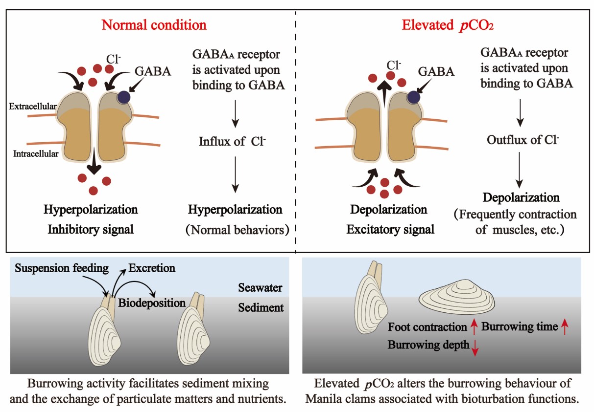 該團(tuán)隊(duì)在創(chuàng)建原位酸化模擬實(shí)驗(yàn)系統(tǒng)的基礎(chǔ)上,以重要經(jīng)濟(jì)貝類長牡蠣和菲律賓蛤仔為實(shí)驗(yàn)對象,采用“現(xiàn)場流水系統(tǒng)+PAMAS+PreSens”的貝類生理能量學(xué)標(biāo)準(zhǔn)化測定方法,系統(tǒng)解析了長牡蠣和菲律賓蛤仔對海洋酸化脅迫的生理響應(yīng)及其調(diào)節(jié)機(jī)制。結(jié)果表明,海洋酸化脅迫顯著降低了長牡蠣的濾水率,增加了耗氧和排氨率,導(dǎo)致了其生長余力的降低;海洋酸化脅迫通過影響菲律賓蛤仔細(xì)胞內(nèi)外的酸堿平衡狀態(tài)(pH、[HCO3-]等),逆轉(zhuǎn)γ-氨基丁酸A型神經(jīng)受體(GABAA受體)的功能(即由輸出抑制信號轉(zhuǎn)變?yōu)檩敵雠d奮信號),進(jìn)而導(dǎo)致菲律賓蛤仔潛沙行為的改變。