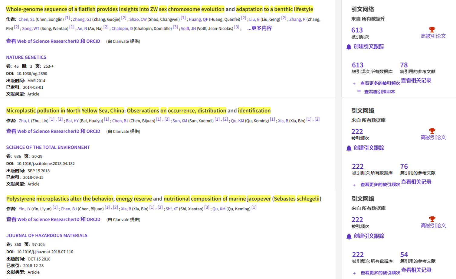 根據基本科學指標數據庫(Essential Science Indicators, ESI)2023年5月11日最新分析數據顯示,中國水產科學研究院黃海水產研究所發表的3篇研究論文《Whole-genome sequence of a flatfish provides insights into ZW sex chromosome evolution and adaptation to a benthic lifestyle》(Chen, SL et al., 2014, Nature Genetics)、《Microplastic pollution in North Yellow Sea, China: Observations on occurrence, distribution and identification》(Zhu, L et al., 2018, Science of the Total Environment)、《Polystyrene microplastics alter the behavior, energy reserve and nutritional composition of marine jacopever (Sebastes schlegelii)》(Yin, LY et al., 2018, Journal of Hazardous Materials)入選ESI高被引論文。本次ESI數據統計區間覆蓋了從2013年1月1日至2023年2月28日期間發表的論文,3篇高被引論文的入選,有力提升了黃海水產研究所在水產生物技術、環境與生態學等領域的學科影響力。