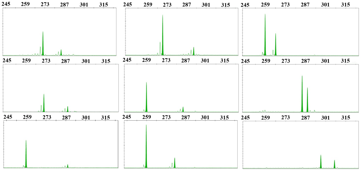本發(fā)明公開(kāi)了一種凡納濱對(duì)蝦微衛(wèi)星標(biāo)記的引物組合及應(yīng)用,屬于分子生物學(xué)技術(shù)領(lǐng)域。在凡納濱對(duì)蝦遺傳選育過(guò)程中,及時(shí)評(píng)估已有群體的遺傳資源現(xiàn)狀,認(rèn)清不同群體甚至個(gè)體間的分子遺傳背景差異,制定合理配種方案,是優(yōu)化國(guó)內(nèi)凡納濱對(duì)蝦種質(zhì)的有效途徑。本發(fā)明提供了一種凡納濱對(duì)蝦微衛(wèi)星標(biāo)記的引物組合及應(yīng)用,微衛(wèi)星分子標(biāo)記的名稱分別為:Lv01、Lv03、Lv09、Lv12、Lv18、Lv55、Lv99、Lv106、Lv119、Lv1291、Lv1292、Lv3201、Lv3202和Lv1969,所有微衛(wèi)星分子標(biāo)記穩(wěn)定擴(kuò)增且具有多態(tài)性,可用于凡納濱對(duì)蝦種質(zhì)資源遺傳多樣性和遺傳結(jié)構(gòu)分析及家系鑒定,為凡納濱對(duì)蝦的遺傳改良提供了新的工具。