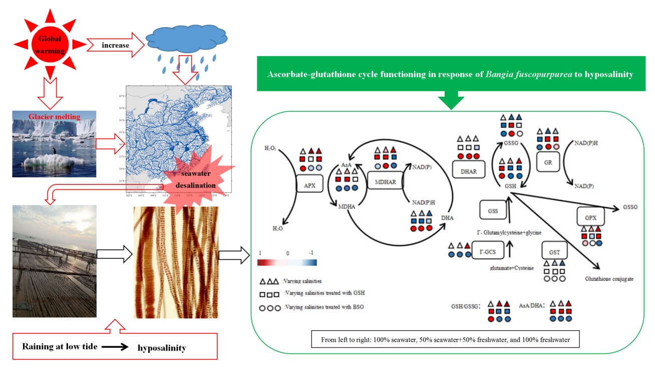 紅毛菜是一類古老而原始的紅藻,兼具海水種和淡水種(暗紫紅毛菜,Bangia atropurpurea)。其海水種Bangia fuscopurpurea(中文種名同屬名:紅毛菜)自然生長于潮間帶,具有極高的營養價值,為我國特色栽培海藻物種,2021年入選農業農村部“十大優異水產種質資源”。紅毛菜和暗紫紅毛菜均具有很強的適應鹽度變化的能力,但有關機制尚不明確。