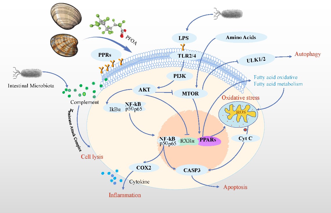 全氟烷基物質(PFASs)是全球重點管控的一類新污染物,以水產品對其高蓄積特性所造成的生態和食品安全風險尤為嚴峻。團隊從免疫代謝的角度剖析了全氟辛酸(PFOA)對貝類免疫系統的毒性效應,發現PFOA的脅迫可改變貝類腸道的優勢菌群組成,干擾膽汁酸等關鍵脂質代謝途徑,影響腸屏障功能完整性,進而降低貝類的免疫防御功能。在此過程中,TLR/MyD88/NF-kB、PI3K-Akt-mTOR等免疫信號通路發揮了重要的調控作用。