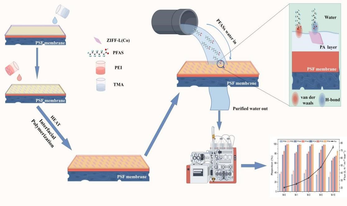 隨后,該團隊針對養殖水體中PFASs的引入可能導致的水產品安全風險,采用界面聚合策略合成了一種新型的摻雜金屬有機骨架納米填料的復合納濾膜,可高效去除水體中達到或超過環境濃度的PFASs。將納濾膜用于水體中PFASs的分離,膜的水通量達到47.56 L·m–2·h–1·bar–1,對典型PFASs 的去除率超過95%(PFOS為 98.47%,PFOA為95.85%)。此技術為養殖水體中新污染物的減除提供了一種高效、綠色的技術手段。