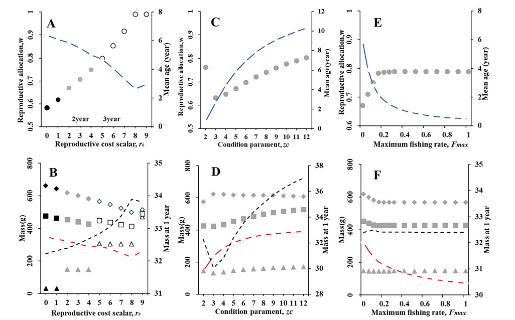 不同能量繁殖成本和死亡率下最優繁殖分配(A, C, E)和生命史特征 (B, D, F)的變化