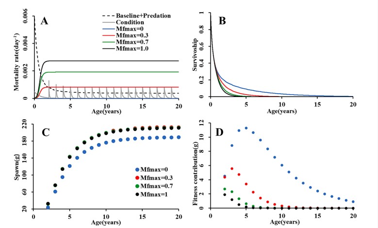 在不同的捕撈壓力下,小黃魚的死亡率(A)、存活率(B)、產卵量(C)和不同年齡的適應度貢獻(D)
