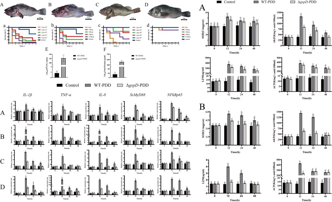 進(jìn)一步研究發(fā)現(xiàn),PDD存在不同的毒力基因型,致病力最強(qiáng)的菌株具有強(qiáng)溶血性和磷脂酶活性,并且可編碼全部的Ⅱ型分泌系統(tǒng)(T2SS)結(jié)構(gòu)蛋白,具有完整的T2SS系統(tǒng)。通過基因敲除實(shí)驗(yàn)證實(shí),T2SS結(jié)構(gòu)基因gspD的缺失使得強(qiáng)致病力菌株及其胞外產(chǎn)物的溶血活性、磷脂酶活性顯著降低甚至消失;而回補(bǔ)株菌液與ECP的溶血活性恢復(fù)到了野生株的81%與60%的水平,磷脂酶活性恢復(fù)到了野生株的86%與85%的水平(圖1)。對許氏平鲉的人工回接感染實(shí)驗(yàn)表明,gspD基因缺失株對許氏平鲉的半數(shù)致死量(LD50)較野生株降低62.7倍,致病力及其引起的炎癥反應(yīng)明顯減弱,證明T2SS在PDD的致病過程中發(fā)揮著極為重要的作用(圖2)。這是繼團(tuán)隊(duì)首次報(bào)道PDD是導(dǎo)致渤海灣深遠(yuǎn)海養(yǎng)殖許氏平鲉患“敗血性皮膚潰瘍癥”的致病菌(Zhang et al., 2019)等工作之后,在PDD致病機(jī)制方面取得的又一重要進(jìn)展。研究成果為進(jìn)一步推進(jìn)團(tuán)隊(duì)在深遠(yuǎn)海養(yǎng)殖魚類疫苗和綠色藥物方面的研發(fā)進(jìn)程奠定了重要基礎(chǔ)。