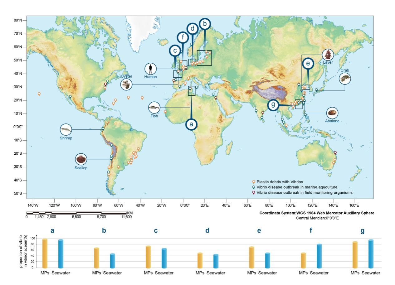 全球海洋塑料監測中發現弧菌的位點和周圍水域生物疫病爆發概況