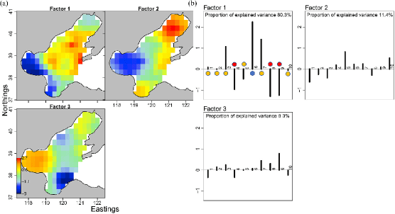 相遇概率空間變化的3個因子的空間效應和各魚種對各因子的估計載荷