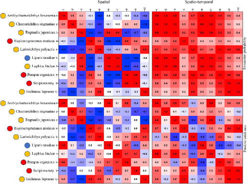 團隊基于渤海10種關鍵魚類10年漁業資源調查數據,構建了多物種時空模型(VAST),研究發現:1)渤海低經濟捕食者種類的雙重角色:細紋獅子魚和黃鮟鱇等低經濟價值捕食者與重要餌料魚鳀呈現顯著空間正相關(熱點區域重疊率達88%以上);并且這些捕食者資源量近年來持續上升,對小黃魚、銀鯧等高經濟價值魚類產生強烈負作用(時空密度負相關系數達-0.8);2)“食物-風險權衡”驅動渤海魚類棲息地分化:小黃魚雖以鳀為主要食物,但需規避捕食者,其分布熱點與鳀顯著分離,這一“生存策略”使得小黃魚種群近年來集中在渤海遼東灣北部及黃河口,而非歷史上的渤海全域分布模式;3)渤海具有不同空間分布的四大類群:模型識別出渤海四類生態功能群,具有明確空間分隔特征,不同類群間棲息地重疊度低,為針對性漁業資源管理奠定基礎。