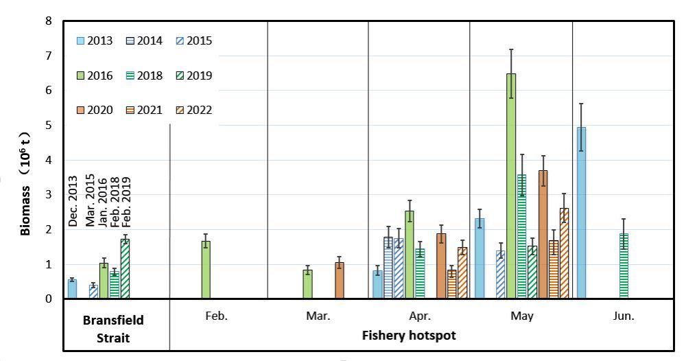 研究綜合利用區域網格化、自舉法(bootstrap)與擴展Delta分布模型(RGED)等方法,構建了漁船生產期間采集無序聲學數據的科學化應用與中心漁場磷蝦生物量的資源評估方法,利用我國漁船2012-2022年持續10余年在南極布蘭斯菲爾德海峽中心漁場內采集的漁船聲學數據,首次系統評估了該區域內磷蝦資源的季節動態變化。