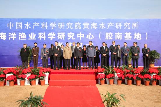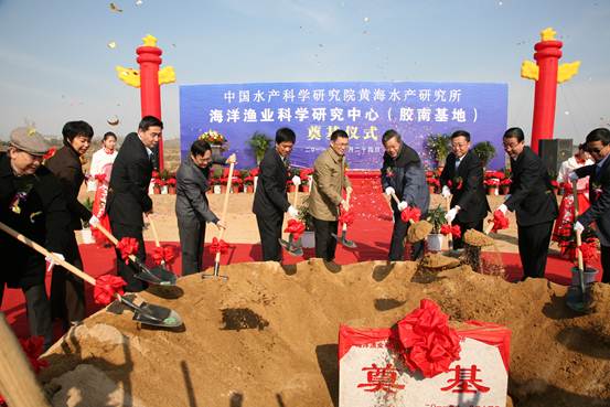 11月24日,黃海水產研究所海洋漁業科學研究中心奠基儀式在青島膠南市隆重舉行。中國科協副主席、中國工程院院士唐啟升,農業部市場與經濟信息司司長張合成,農業部漁業局計財處處長董金和,山東省農業廳副廳長高明飛,青島市人民政府副秘書長于成璞,青島市農業委員會主任趙澤斌等有關單位領導,中國水產科學研究院院長張顯良、副院長劉晴,膠南市人民政府市長姜軍建、副市長張新竹以及有關單位領導,黃海所趙法箴院士、雷霽霖院士以及中層以上干部、老專家代表共130余人參加了奠基儀式。儀式由黃海所殷邦忠副所長主持。