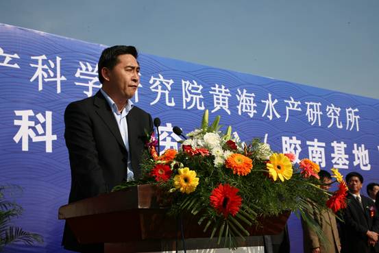 黃海所所長王清印首先致歡迎詞,熱烈歡迎各位來賓在百忙之中參加海洋漁業科學研究中心奠基儀式,感謝各級領導和社會各界朋友一直以來對黃海所的關心、支持和幫助。黃海所海洋漁業科學研究中心的建設目標是將其建設成為集“海洋漁業科學研究與創新、國內外學術交流、高層次人才培養、科技推廣與科普展示”于一體的國內一流的現代化海洋漁業科技研發平臺?!爸行摹甭鋺裟z南,將更好的發揮黃海所在海洋漁業科技方面的優勢和膠南市的人文地理優勢,也將為膠南市藍色經濟區的建設提供更加有力的科技支撐。他表示,要高標準、嚴要求,將“中心”建設好,為我國漁業科技事業和漁業經濟的發展、為地方經濟建設做出更大的貢獻。