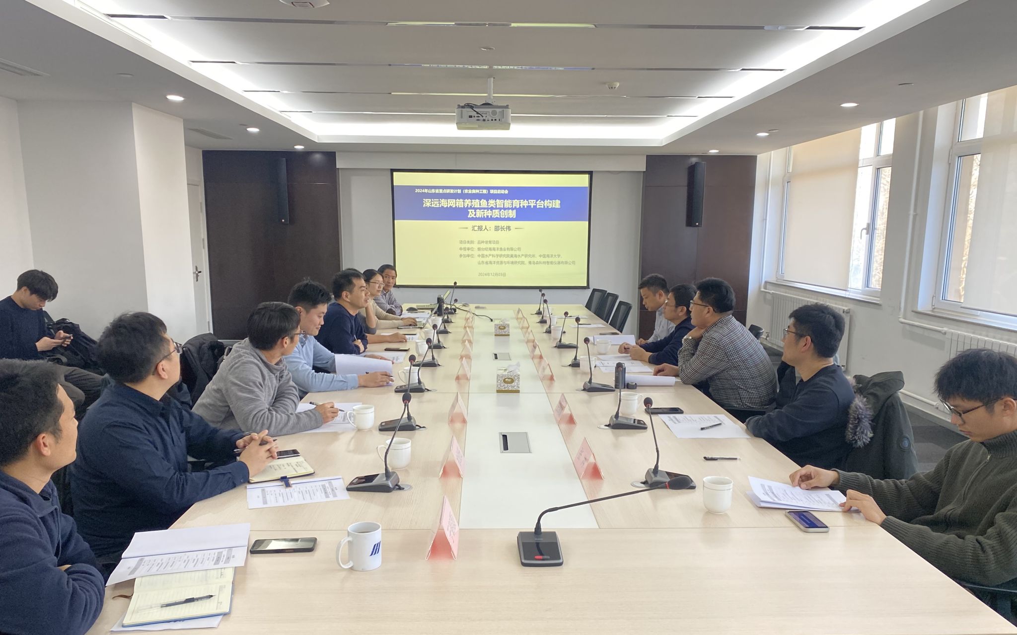 12月3日,山東省重點研發計劃(農業良種工程)“深遠海網箱養殖魚類智能育種平臺構建及新種質創制”項目啟動會在煙臺召開,項目負責人中國水產科學研究院黃海水產研究所副所長邵長偉研究員和項目組成員等10余人參加。中國科學院煙臺海岸帶研究所王春德研究員、煙臺市海洋經濟研究院張建柏書記、魯東大學王凱教授作為項目執行咨詢專家組專家應邀參會,會議由項目承擔單位負責人煙臺經海海洋漁業有限公司曹學彬經理主持。