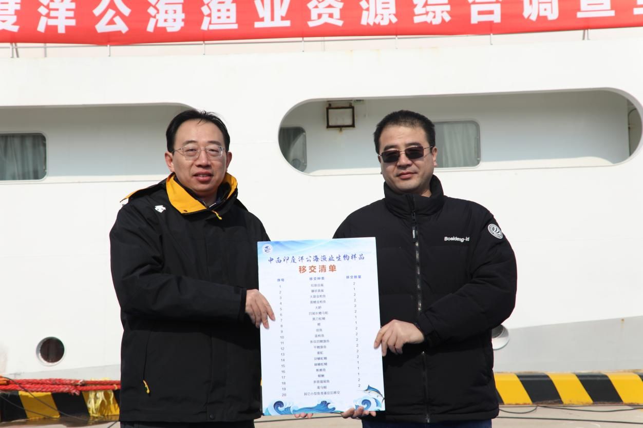 2月18日上午,中國水產(chǎn)科學研究院黃海水產(chǎn)研究所“藍海101”號海洋漁業(yè)綜合科學調(diào)查船(以下簡稱“藍海101”號調(diào)查船)再次圓滿完成中西印度洋公海漁業(yè)資源綜合科學調(diào)查兩個項目任務(wù),順利返航。黃海所黨委書記趙憲勇,副所長葉乃好、邵長偉,中國遠洋漁業(yè)數(shù)據(jù)中心副主任呂澤華以及黃海所相關(guān)部門人員等到碼頭迎接,并就采集的代表性大洋漁業(yè)生物樣品與國家海洋漁業(yè)生物種質(zhì)資源庫進行了現(xiàn)場交接。活動由葉乃好副所長主持。