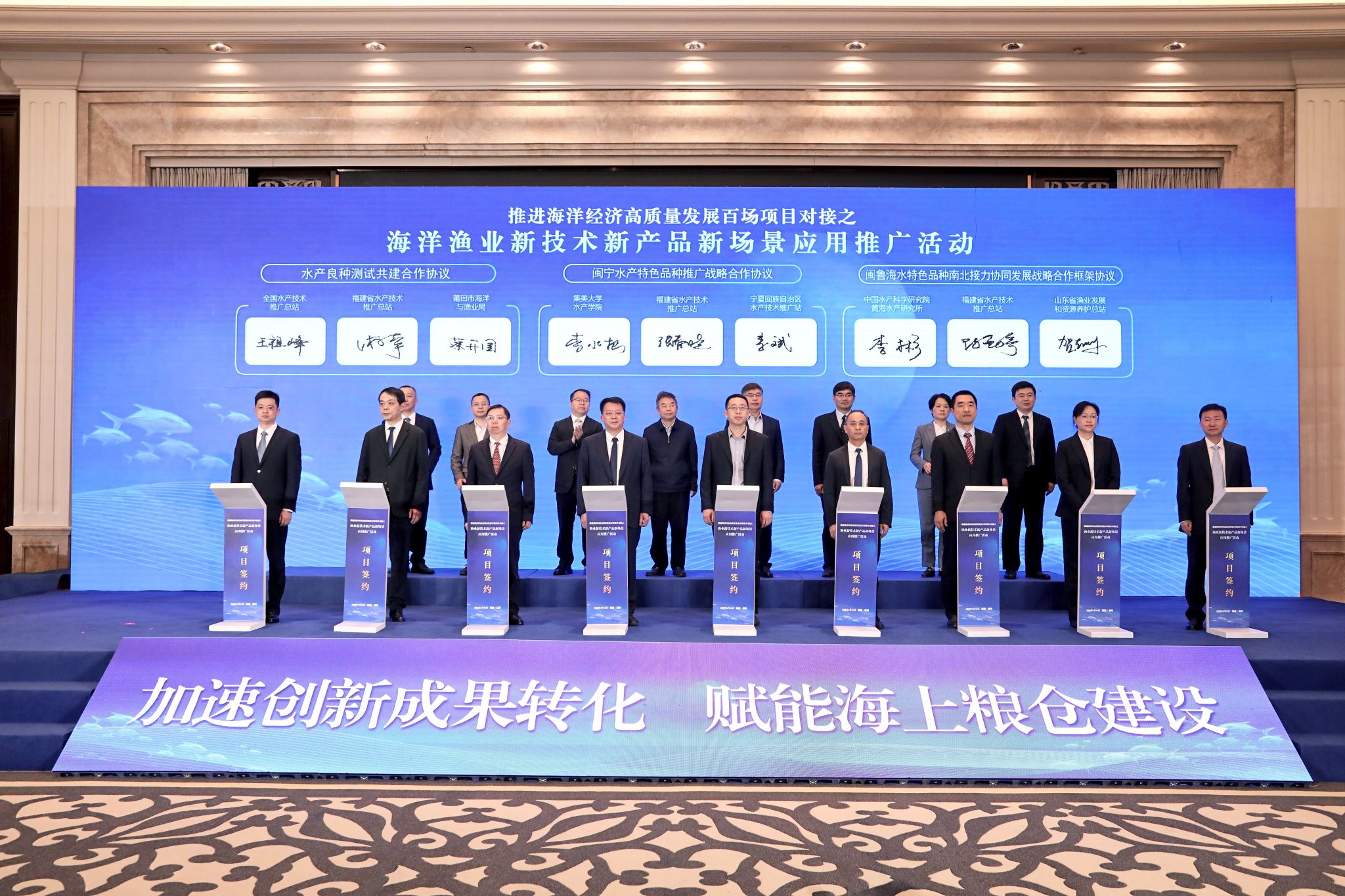 黃海所與福建省水產技術推廣總站、山東省漁業發展和資源養護總站現場簽署了《閩魯海水特色品種“南北接力”協同發展》戰略合作框架協議,三方將共同致力于特色品種“南北接力”養殖產業關鍵技術的創新研發以及推廣示范工作,充分整合各自在海參、海帶、綠鰭馬面鲀等海水特色養殖品種的科研、推廣、培訓等方面優勢資源,組建跨區域的漁業產業研發與應用推廣團隊,構建產學研協同發展平臺,形成“北繁南推、南育北引、技術互通”三位一體的接力發展新模式,大力推動我國海洋漁業產業蓬勃發展。