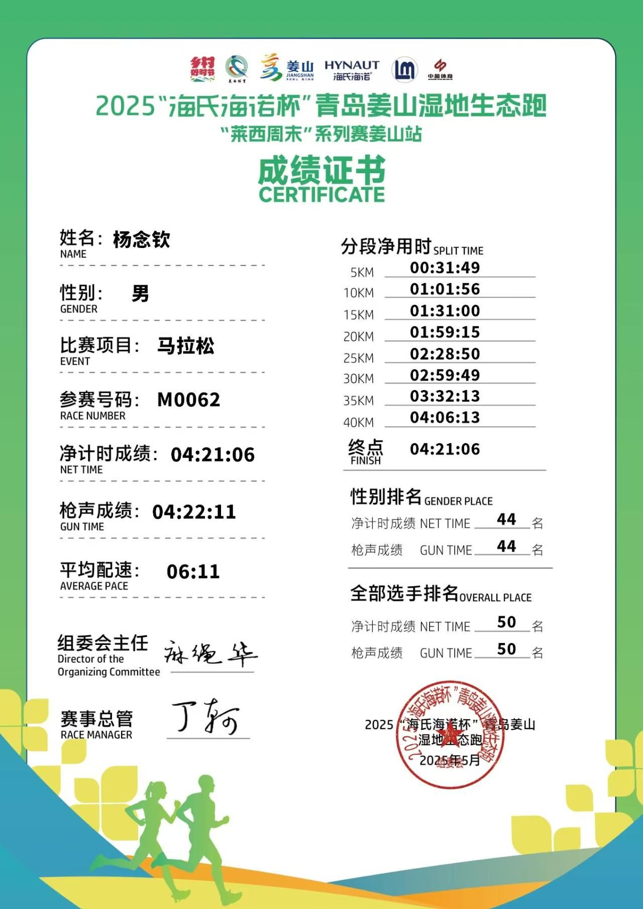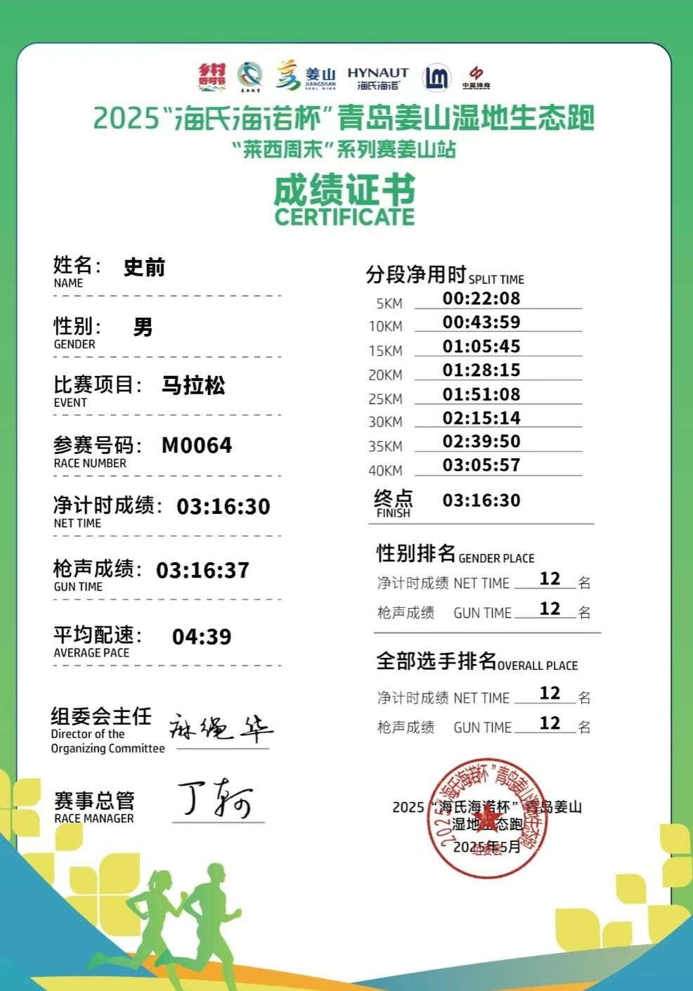 黃海所跑團共有7名隊員參加比賽,2人參加全程馬拉松,5人參加半程馬拉松。參賽隊員們個個精神煥發、士氣高昂,在賽道上奮勇拼搏、勇往直前,用腳步丈量濕地生態之美,用激情點燃運動活力。史前、楊念欽分別取得全程馬拉松第12、50名的好成績,其他隊員均安全完賽。