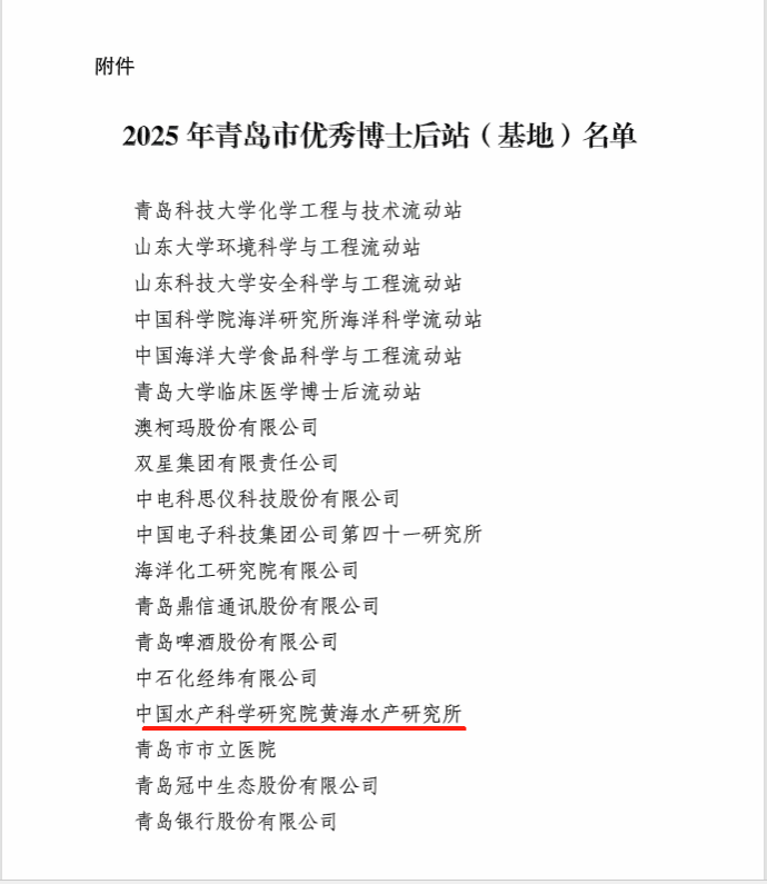 近日,青島市人力資源和社會保障局公布了2025年青島市優秀博士后站(基地)名單,中國水產科學研究院黃海水產研究所名列其中,這是黃海所繼2023年后再次獲得該項表彰。據悉,2025年青島市優秀博士后站(基地)共評選31家。