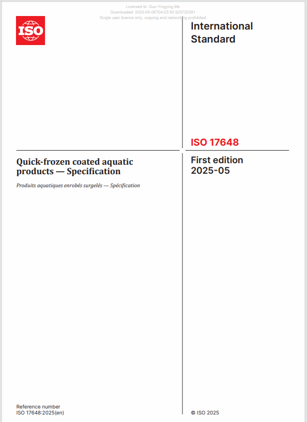 近日,由中國水產(chǎn)科學研究院黃海水產(chǎn)研究所/全國水產(chǎn)標準化技術(shù)委員會水產(chǎn)品加工分技術(shù)委員會牽頭制定的國際標準ISO 17648:2025《速凍裹衣水產(chǎn)制品—產(chǎn)品規(guī)范》(Quick-frozen coated aquatic products—Specification)由國際標準化組織正式批準發(fā)布。該標準是我國牽頭制定的首個調(diào)理水產(chǎn)制品國際標準,也是繼我國牽頭制定并獲批發(fā)布ISO首個水產(chǎn)領(lǐng)域國際標準ISO 23855:2021《冷凍魚糜—產(chǎn)品規(guī)范》(Frozen surimi—Specification)之后的又一項新突破。