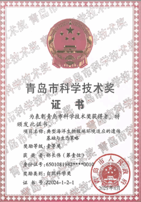 近日,青島市召開全市科技創新大會, 會上 宣讀了《青島市人民政府關于2024年度青島市科學技術獎勵的決定》。中國水產科學研究院黃海水產研究所副所長邵長偉研究員團隊領銜,聯合中國科學院海洋研究所、青島華大基因研究院共同完成的“典型海洋生物極端環境適應的遺傳基礎與生態策略”研究成果榮獲青島市自然科學獎一等獎。