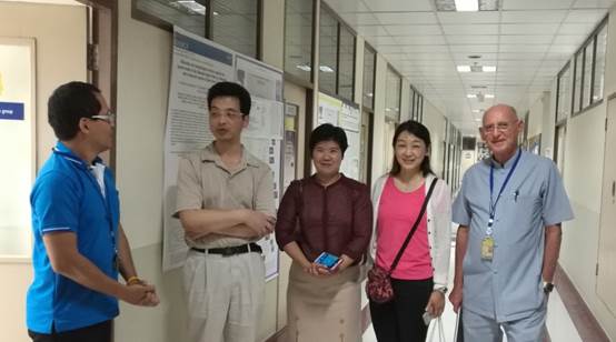 訪問泰國國立瑪希隆大學實驗室,右一為Tim Flegel教授,右三為Kallaya Sritunyalucksana研究員(泰國?BIOTEC)