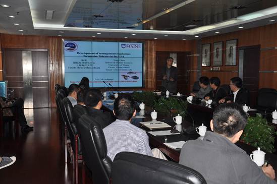 10月12日,應(yīng)農(nóng)業(yè)部海洋漁業(yè)可持續(xù)發(fā)展重點(diǎn)實(shí)驗(yàn)室的邀請(qǐng),緬因大學(xué)終身教授、上海海洋大學(xué)國(guó)際海洋研究中心首席科學(xué)家陳勇與上海海洋大學(xué)人事處處長(zhǎng)楊昕、農(nóng)業(yè)部大洋漁業(yè)資源環(huán)境科學(xué)觀測(cè)實(shí)驗(yàn)站(依托單位上海海洋大學(xué))站長(zhǎng)戴曉杰等一行8人訪問黃海水產(chǎn)研究所。黃海所所長(zhǎng)金顯仕、副所長(zhǎng)趙憲勇及相關(guān)人員接待了陳勇一行,并與來賓開展了學(xué)術(shù)交流與合作研討。