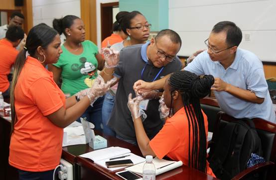 會上,科研處副處長徐甲坤向來自南非、肯尼亞、加納、柬埔寨、菲律賓、泰國、圭亞那、古巴、蘇里南等9個國家學員簡要介紹了黃海水產研究所歷史沿革、科研成果和國際合作等方面的基本情況。病研室張慶利研究員等科研人員詳細講解了我所自主研發的水產養殖病原現場快速高靈敏度檢測試劑盒的原理,演示了試劑盒的使用操作方法,并現場指導學員進行了試劑盒的操作演示,反響熱烈。應廣大學員需求,我所向菲律賓、南非、古巴、肯尼亞和柬埔寨5國提供對蝦及魚類病原檢測試劑盒50余套。病研室楊冰副研究員介紹了對蝦白斑?。╓SD)和傳染性皮下及造血組織壞死?。↖HHN) OIE參考實驗室運行情況。隨后,學員們實地參觀了病研室、對蝦白斑病(WSD)和傳染性皮下及造血組織壞死?。↖HHN)OIE參考實驗室及國家級水產品質檢監督檢驗中心,并與相關科研人員就感興趣的問題進行了深入溝通與交流。