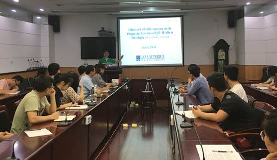 李軍博士做了題為“Effects of Cell Differentiation on the Phagocytic Activities of IgM+B cells in Nile tilapia (Oreochromis niloticus)”的學術報告,詳細介紹了羅非魚吞噬免疫過程中細胞分化作用的最新研究進展,并建議與會人員立足于水產養殖實踐和產業需求開展科學研究與技術創新,重視水產生命現象和過程中蘊含的重大科研命題。李軍博士的精彩報告給與會人員帶來了深刻啟發,引起了他們的強烈興趣,并展開了熱烈討論。