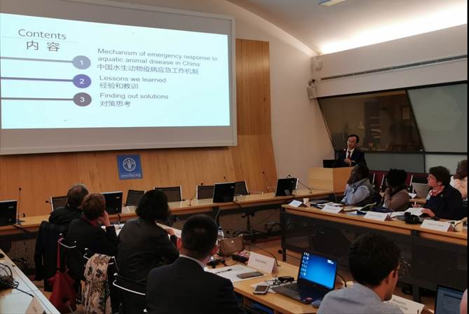 本次研討會由FAO主辦,是水生動物疫病防控領域的重要國際會議之一,旨在召集國際水生動物疫病防控領域的專家商討水生動物緊急疫情的應對方案和指南,審議水生動物緊急疫情應對決策的草案。會議期間,張慶利研究員應中方代表團委托做了題為“中國水生動物疫病應急工作情況簡介(Response Actions to Aquatic Animal Diseases Emergencies in China)”的報告,介紹了中國在水生動物疫病應對方案領域的最新工作進展和研究成果,引起了與會專家的強烈興趣。張慶利研究員和董宣副研究員還參與審議了水生動物大規模死亡事件應急處理的決策樹和應對方案草案。