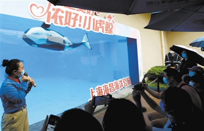 6月12日,位于上海市浦東新區的上海海昌海洋公園正式恢復常態化運營。同日,該公園繁育的一頭虎鯨寶寶也在園內正式亮相。目前,公園按照最大承載量的75%進行游客接待。圖為一位講解員在小虎鯨見面會活動中講解。新華社記者 方喆攝